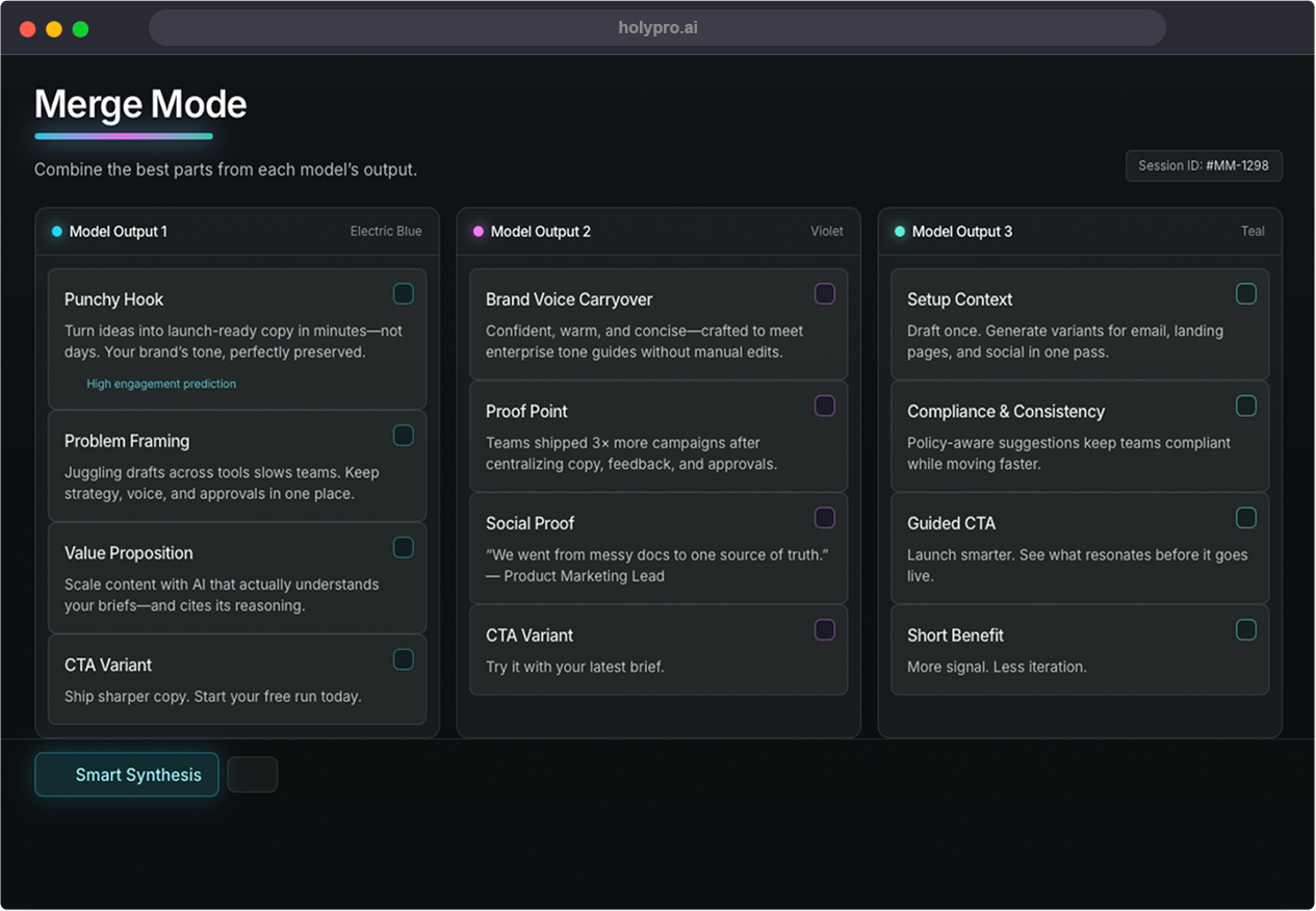 HOLY shows outputs from multiple models with tone, cost, and accuracy insights — so you can choose the best or blend them instantly.