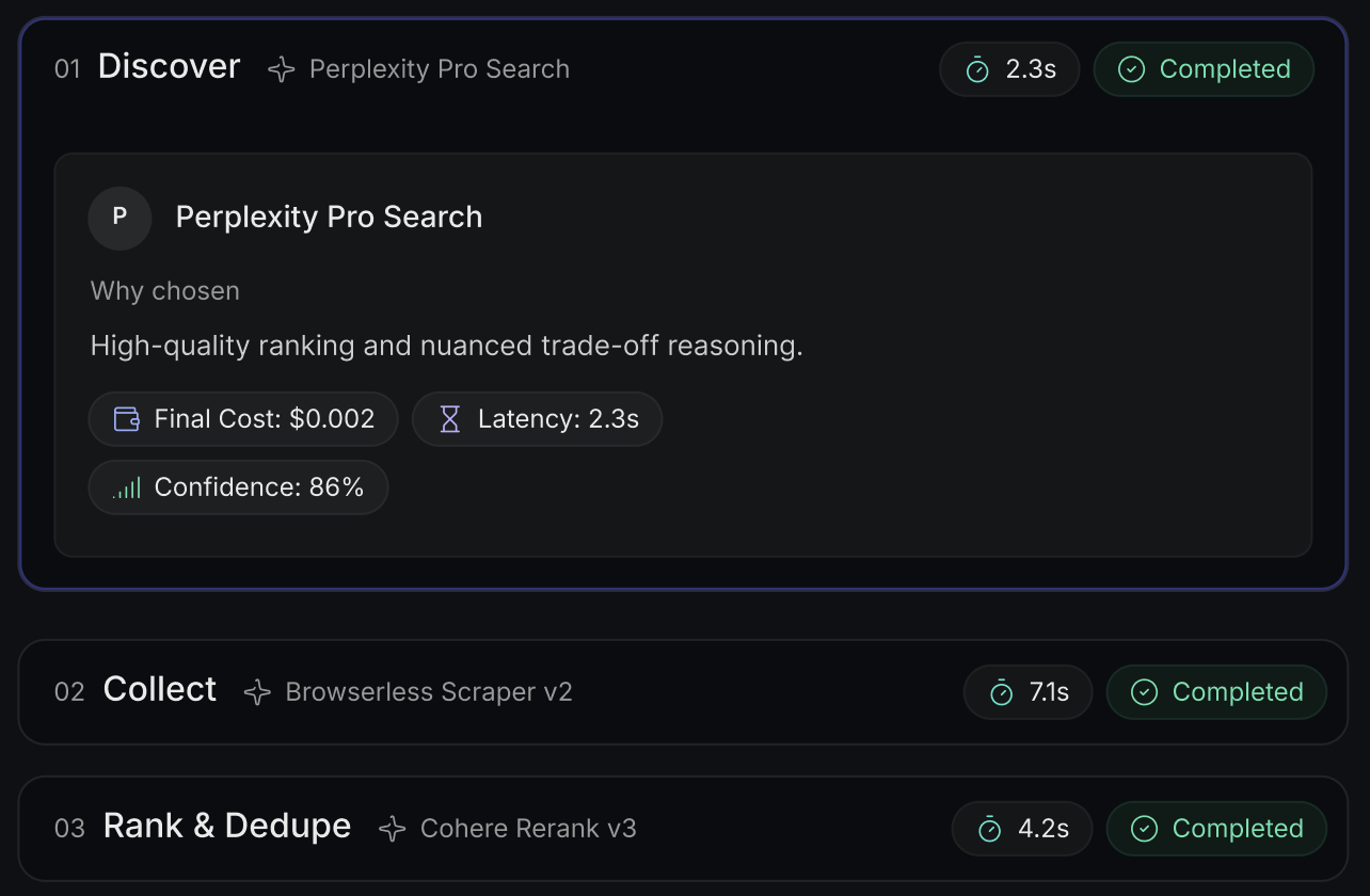 Automatically selects and connects to the best LLM models for each step of your task.