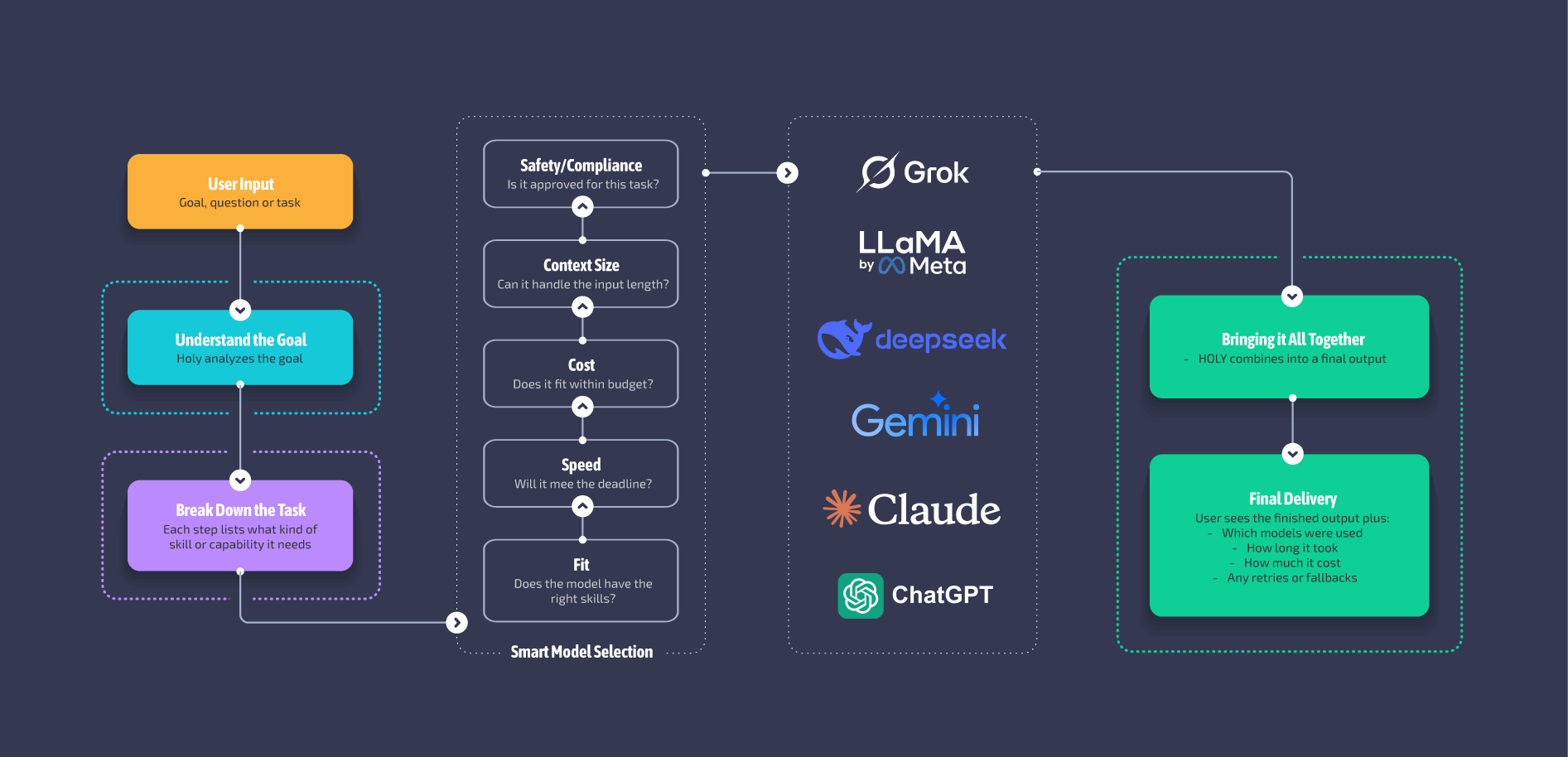 HOLY is a standalone, web-based application designed to be the master interface layer between humans and the growing ecosystem of Larbe Multimodal Models (LMMs). Rather than asking users to choose the “right model” for each task, HOLY abstracts that complexity through goal-based input, smart routing, and multi-step execution workflows – acting as an intelligent layer that gets the job done, regardless of which model does it.